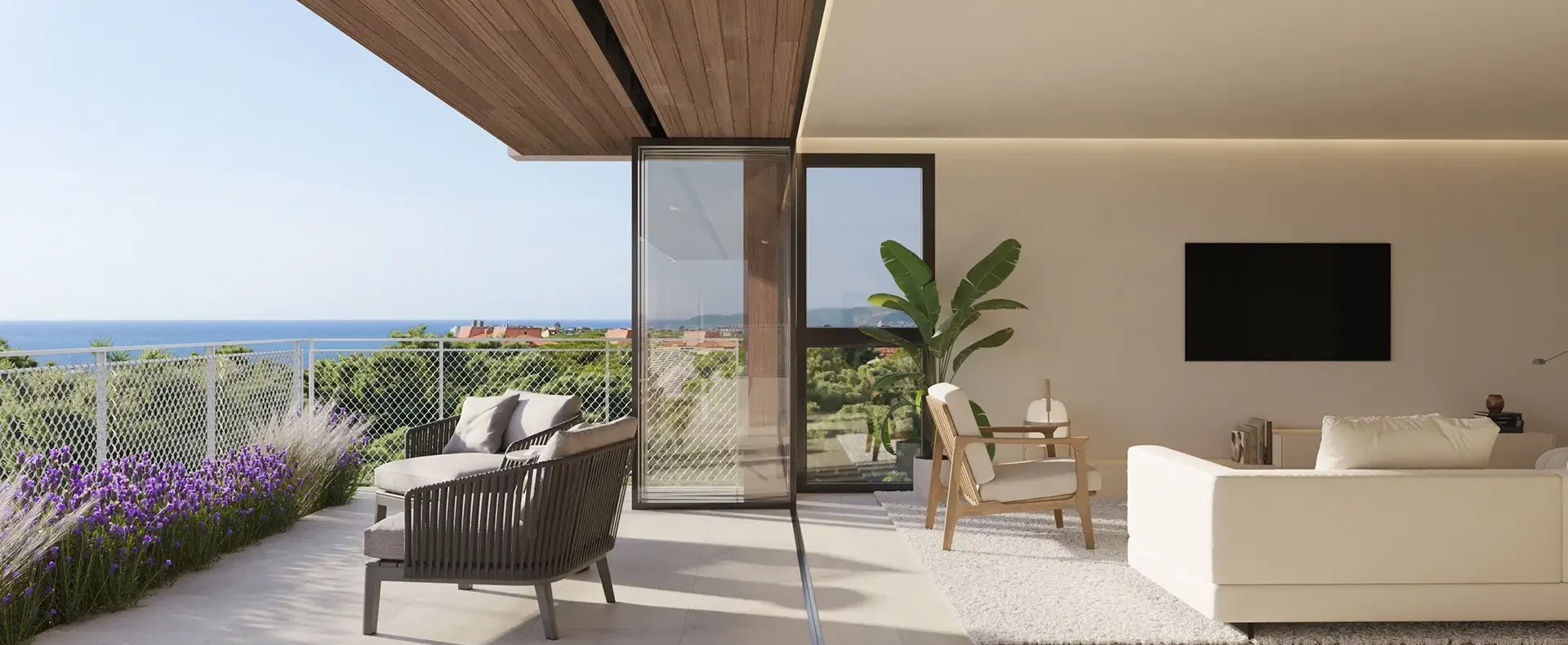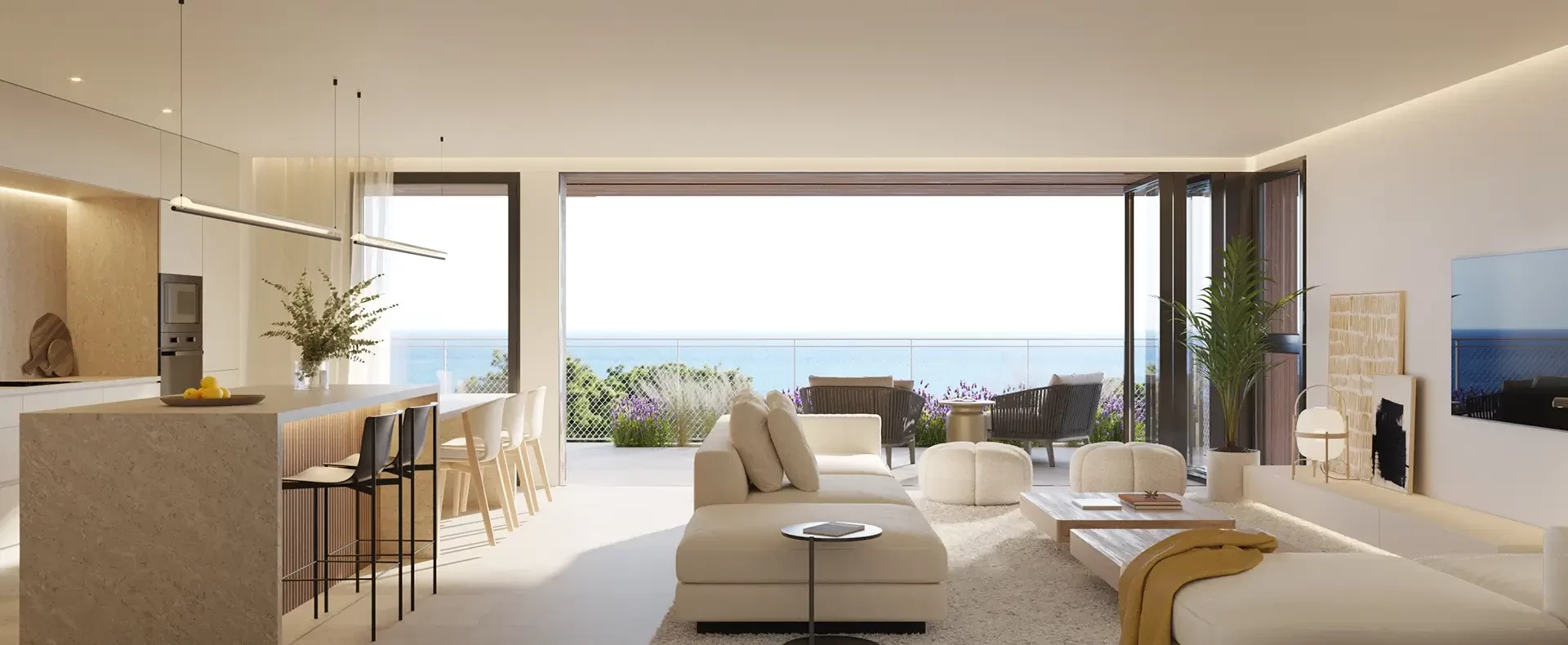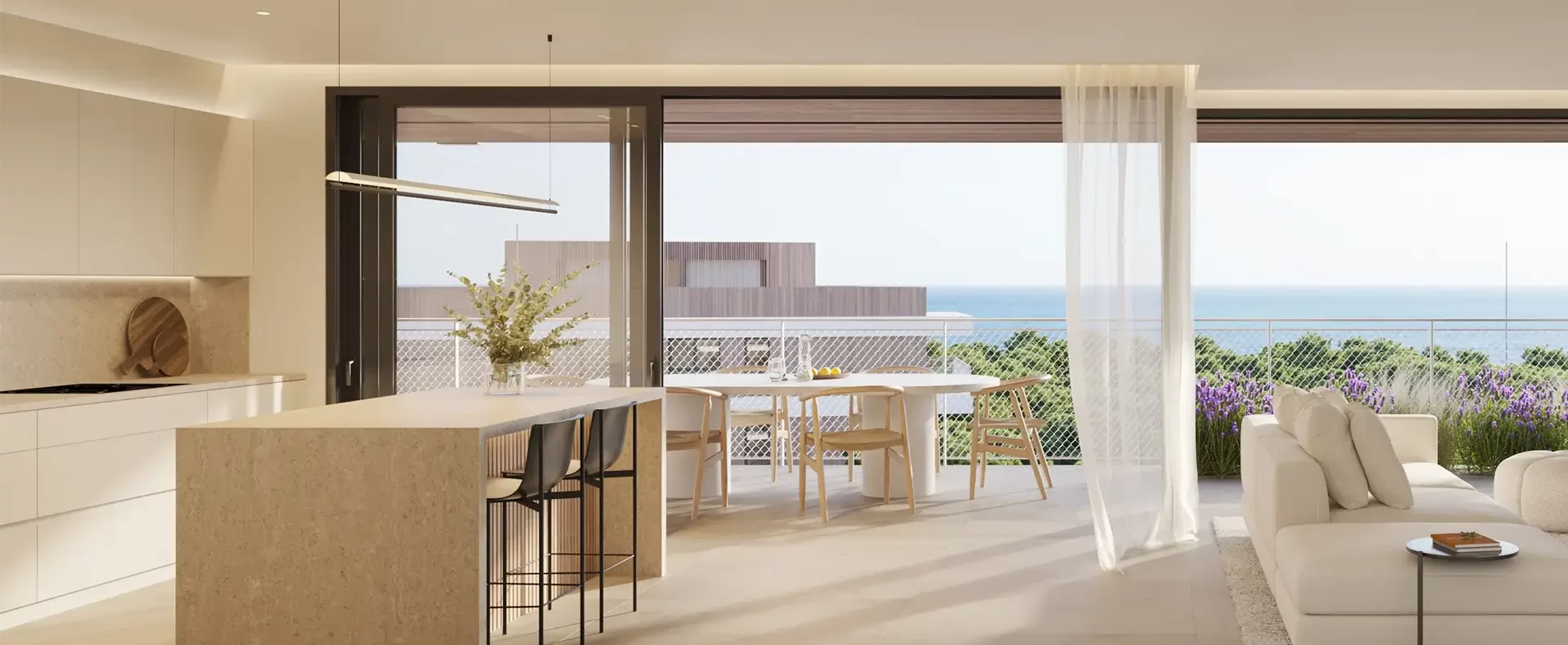 Premium finishes and organic materials connect the interiors with the outdoors through natural tones and smart sliding doors. Whether you want to relax, work from home, exercise or entertain guests, sunny days invite you to fully open your home to the garden or private terrace.